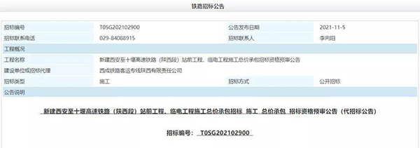 11月5日,在初步設計批復以后,《新建西安至十堰高速鐵路(陜西段)站前工程、臨電工程施工總價承包招標資格預審公告》、《新建西安至十堰高速鐵路(陜西段)“四電”系統(tǒng)集成工程施工總價承包招標》正式發(fā)布。